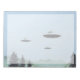 A watercolor, pen and ink, and color pencil drawing of three saucer UFOs over the mountains.