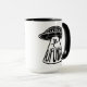 Vector cartoon illustration of a UFO abducting a person that thinks aliens rock with UFOMG text. Tags: UFO, OMG, unidentified, flying, object, oh, my, god, space, spaceship, alien, martian, cartoon, devil, horns, abduction, fourth, kind, humor, saucer