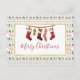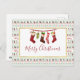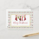 A holiday greeting postcard with a repeating pattern in the background, in an ugly Christmas sweater style. The pattern is composed of socks, christmas balls, stars and snowflakes. With the repeating Merry Christmas text in red. Fun and festive. Layered over top is a white rectangle with a faux gold foil border, inside is an illustration of old-fashioned hanging stockings and the text "merry Christmas. The back has a message which you can personalize.