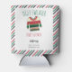 This design features an ugly sweater baby shower theme with a sweater illustration in red green and black colors.