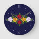 The traditional red, yellow and white roses, found on narrow boats in the UK on a wall clock for the galley with a customizable background colour.