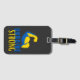 Dark luggage tag design has flexed bicep muscle graphic with Ukraine strong text in blue and yellow colors of the Ukrainian flag. Slava Ukraini!