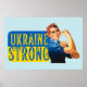 Honoring the women of Ukraine, this poster design features "Ukraine Strong" text on the Ukrainian flag with the iconic vintage Rosie the Riveter illustration.