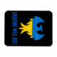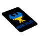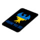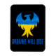 An inspirational magnet design that echoes the resilience of the Ukrainian people features a phoenix bird silhouette in the blue and yellow colors of Ukraine's flag with "Ukraine will rise" text in distressed font.