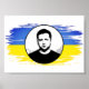 Painted look blue & yellow Ukrainian flag with a black & white picture of Ukraine President Volodymyr Zelenskyy