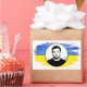 Painted look blue & yellow Ukrainian flag with a black & white picture of Ukraine President Volodymyr Zelenskyy