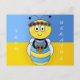 a little bee colored in the national colours caring a trident, wearing the red beads and flower wreath.