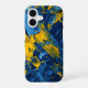 A vibrant abstract painting featuring thick, impasto brushstrokes of deep blue and bright yellow paint. The colors are layered and intertwined, creating a dynamic sense of motion and texture. The expressive strokes move in various directions, with the yellow and blue colors mixing in some areas while remaining distinct in others. The overall effect is energetic and textural