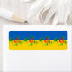 Decorative pattern with red flower and green folk-style leaves against the background of the Ukrainian flag.