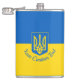 Vinyl wrapped flask with the flag of Ukraine, a blue and yellow flag with the Ukrainian coat of arms (emblem) with a trident in the center, and a custom text template for your message