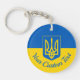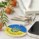 Round acrylic keychain with the flag of Ukraine, a blue and yellow flag with the Ukrainian coat of arms (emblem) with a trident in the center, and a custom text template for your message