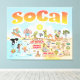 Bright and colorful art offers a spectacular view of Southern California - wacky characters frolic on the beach and desert of SoCal showcasing Los Angeles, Orange County, San Diego, Santa Barbara, Riverside, Palm Springs, El Centro, Anza Borrego and Joshua Tree parks as well as the border cities of Tijuana, Tecate and Mexicali. This charming scene has it all – a surfer hangs ten while a killer whale leaps out of the water, zoo animals greet the tourists, a muscular fellow flexes to impress as a T-Rex roars a challenge and a tank moves into position and much more…
