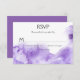 Ultra Violet Watercolor Splashes RSVP. Ultra Violet is s color of the year for 2018. The template is easy to personalize if you choose to change the text. The back of the card is a solid mint green. There is a matching wedding invitation. If you would like the design on something not shown, please contact me through my store or email me at shutterbug600@yahoo.com.