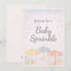 Soft pastel rain theme, muted blue peach and cream tones, watercolor style for baby sprinkle gatherings. Features umbrella illustrations with scattered raindrops on a textured background, ideal for hosting a light, seasonal celebration welcoming a new baby.