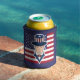 Can cooler with an illustration of Uncle Sam with the American flag as a background, 4th of July patriotic design by Maxi Harmony / Radka Kavalcova; blue version