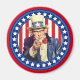 A symbol of the United States, National Pride and call to action, this image of Uncle Sam includes a round stars and stripes background in red, white and blue.