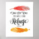 Typography Design with calligraphy and glyphs with words in black, "Under His Wings you will find Refuge." Design is centered between two watercolor feather illustrations (red and orange) on top and bottom center of design. Scripture is from Psalm 91:4.