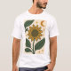 This design features a bold sunflower illustration at its core, displaying vibrant yellow petals that radiate from a detailed, textured center. Dark-veined green leaves frame the flower, adding depth and natural contrast. Whisper-soft beige in the background highlights every petal and leaf, while a crescent moon and scattered stars introduce a whimsical, celestial element that balances earthly warmth with cosmic wonder.