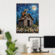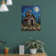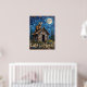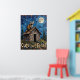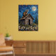 This imaginative painting captures a raccoon perched high on a log cabin roof, with its gaze directed towards the viewer. The background is a stunning, textured night sky with a large, glowing full moon. The surrounding woods are painted in dark, mystical tones. The words "Cute but feral" are a playful and bold addition to the bottom of the artwork, tying the scene together.