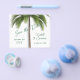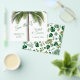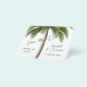 Tropical palm tree, budget save the date wedding announcement printed on flyer paper. A single palm tree in the center of white cards with palm fronds hanging over text. “Save the date” text is angled. Date is on one side of the trunk with names and location of event on the other. The back has a tropical leaves pattern in shades of green. Color is green and white for a simple, clean design.
