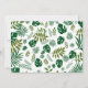 Tropical palm tree save the dates. A single palm tree in the center of white cards with palm fronds hanging over text. “Save the date” text is angled. Date is on one side of the trunk with names and location of event on the other. The back has a tropical leaves pattern in shades of green. Color is green and white for a simple, clean design.