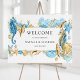 Under the Sea Blue Gold Wedding Welcome Sign featuring seahorses, starfishes, seashells and coral reefs. For more advanced customization of this design, Please click the "Customize” button above! Matching items are also available.