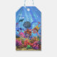 Under the Sea Art gift tag features original art on both sides of kids snorkeling in the ocean watching a puffer fish puff itself up and other wonders. This colorful artwork is also interactive. Can you find all the silly things on the back side? Find a shark sitting on an orange couch watching TV, and a ton of other fun stuff that will capture your eye. This whimsical, fun-filled artwork has curious snorkeling children, sea horses, coral, blow fish, mermaids, starfish, eels and other sea life. Celebrate your kid's birthday this summer with an Under The Sea themed pool party. Have a splash!