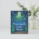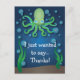 Adorable under the sea green octopus birthday party thank you card. This card features a very cute octopus with eight legs and bubbles around him. The octopus has large and cute eyes and he is floating above the ocean floor. This card is so cute to send your guests after the party to tell them thanks for coming and that you enjoyed their company. Great for boys or girls.
