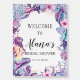 Personalize this chic welcome sign board with your own wording easily and quickly, simply press the customize it button to further re-arrange and format the style and placement of the text. Featuring a pretty mermaid, seahorse, corals and shells in purple, turquoise and pink color scheme. Great for baby shower, bridal shower, birthday party and more! Matching items available in store! (c) The Happy Cat Studio.