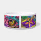 Under the Sea Personalized Pet Bowl designed for a second doggy bowl at the beach, the beach house, or beach bungalow. The bold words in white over the fun ocean sea life artwork is a template for you to change to your pet's name and location or to say anything you want. The fun artwork behind the bold words was digitally painted by our talented kid's book illustrator, Traci Van Wagoner, and shows a variety of fish, coral, crab, eel, anemones, and some silly stuff, like a TV, a cat, a bowl of popcorn, and a cute orange starfish on a beach towel wearing cool sunglasses.