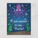 Adorable under the sea violet octopus birthday party thank you card. This card features a very cute octopus with eight legs and bubbles around him. The octopus has large and cute eyes and he is floating above the ocean floor. This card is so cute to send your guests after the party to tell them thanks for coming and that you enjoyed their company. Great for girls.