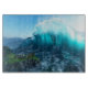 A massive wave leaps up from rough seas, sparkling white and blue and turquoise in the blazing sunlight. Under the wave, about to be submerged, is a little town with a castle and medieval cottages built on a rocky headland.