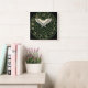 This fantasy art wall clock features a 13 hour face and a green hedge maze commonly called a labyrinth, accented by a white barn owl in full flight.