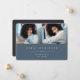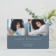 Simple and modern graduation photo announcement features two photos aligned side by side, with the graduate's name, school, and class year beneath in white lettering on a dark dusty blue background. Your graduate's name and school appear beneath. Add a personal message to the back, along with an additional photo.
