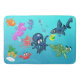 Bath mat with cute cartoon sea creatures, including an octopus and squid, shark, fish, seahorses, a sea turtle, and a crab.