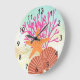 Red-pink coral, an orange sea star, and brown scallop shells against sandy tan and sea blue-green make this wall clock perfect for a beach house, or for anyone who loves the ocean.