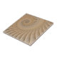 Ceramic tile with "Undertow" by Susan Wallace. Copyright © 2008, Susan Wallace. A sweeping spiral textured with a mirroring spiral pattern, suggesting seashells caught up in a wave; in golden sand with gray highlights.