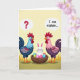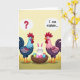 This card features a colorful illustration of two tall, human-like birds facing each other, framing a funny little scene in the middle. The bird on the left wears shades of blue and deep maroon, and its wide-eyed, puzzled look is paired with a thought bubble holding a red question mark. On the right, the second bird is dressed in soft pink and purple tones, glancing over with a slightly bashful, “caught-in-the-act” expression, and its bubble reads “I can explain…” in dark lettering. Between them sits a sturdy woven brown basket like a nest, turning their shared gaze into a teasing, almost flirty standoff, as if they’re in on a secret together. Inside the basket, a small white long-eared bunny relaxes calmly 🐰, adding a sweet, gentle contrast to the birds’ reactions. Around the bunny are speckled eggs in bright turquoise, lime green, and hot pink, their glossy spots making the mix-up feel even more amusing. The background fades from warm yellow at the top into a grassy green foreground, with simple shading and crisp outlines keeping every detail easy to see 🌷. The text bubbles float near each bird’s head, with the red question mark standing out sharply against the pale bubble shape.