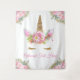 Unicorn baby shower backdrop with adorable unicorn face with pretty gold horn and pink flowers on a pink and gold rose background. This large unicorn baby shower table backdrop is easily customized with the text of your choice. You can also move the unicorn face as needed for your text.