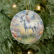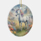 A ceramic ornament showing a dreamy image of a white unicorn with a rainbow mane standing in a field of flowers. In the background are majestic mountains. The perfect gift to give those who love magical and mystical unicorns. Contains generative content.