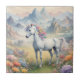 A ceramic tile showing a dreamy image of a white unicorn with a rainbow mane standing in a field of flowers. In the background are majestic mountains. The perfect gift to give those who love magical and mystical unicorns. Contains generative content.
