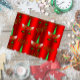 A colorful and festive red unicorn postcard featuring a gorgeous pattern of unicorn faces, with green horns, green eyelids and pretty red poinsettia on their heads. There are golden 'Believe' messages scattered around them, on a vibrant red background. A great Christmas greeting for a unicorn lover.