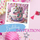 FUN UNICORNS KIDS BIRTHDAY LAYER CAKE ON THE FRONT OF THE CARD. COMPLETELY EDITABLE COPY ON THE BACK.