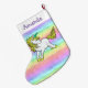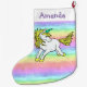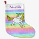 Yellow-Maned Unicorn Design Christmas Stocking, on rainbow wash background and customizable personalization on each side.