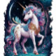 A captivating sticker design featuring an intricately detailed and colorful mythical creature against a crisp white border. The creature is a majestic and enchanting unicorn, adorned with a sparkling golden horn, flowing rainbow mane, and vibrant feathers. The unicorn stands among a lush, enchanted forest with towering trees and glowing flora.