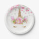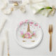 Unicorn paper plates with adorable unicorn face with gold eyelashes and horn on a pretty pink floral and polka dot background. These cute unicorn paper plates are easily customized with the text of your choice, and you can add a background color and remove the dots.