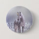 A snow white unicorn with a long flowing mane and tail and a golden horn stands in the gently falling snow in this fantasy artwork by artist Jayne Wilson.