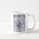 A snow white unicorn with a long flowing mane and tail and a golden horn stands in the gently falling snow in this digital artwork by artist Jayne Wilson.