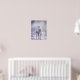 A winter fantasy scene featuring a magical unicorn with a long flowing mane and tail and a golden horn standing in the falling snow. A red cardinal perches on a rock nearby. Fantasy art lovers of all ages will appreciate this poster.
