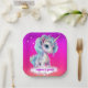 Unicorn birthday party paper plate with a unicorn stansing on a cloud in a solid vibrant pink star background. Customizable text (optional).